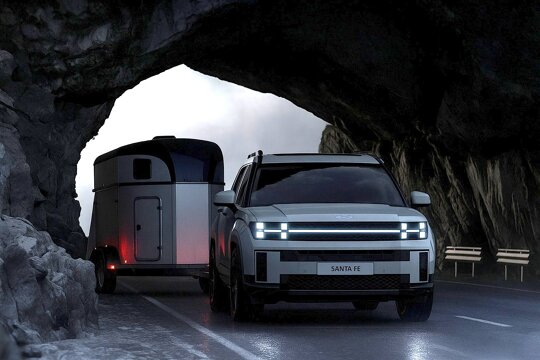 Voor een tweepaards trailer met uitrusting kom je al snel richting 1.700 – 1.900 kg totaalgewicht. De Hyundai SANTA FE Hybrid biedt de reserve die je dan zoekt: krachtig wegrijden op de helling van de manege of slipway, trailer-stabiliteitscontrole voor extra rust bij zijwind en een langere wielbasis voor koersvastheid.